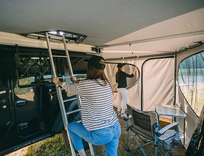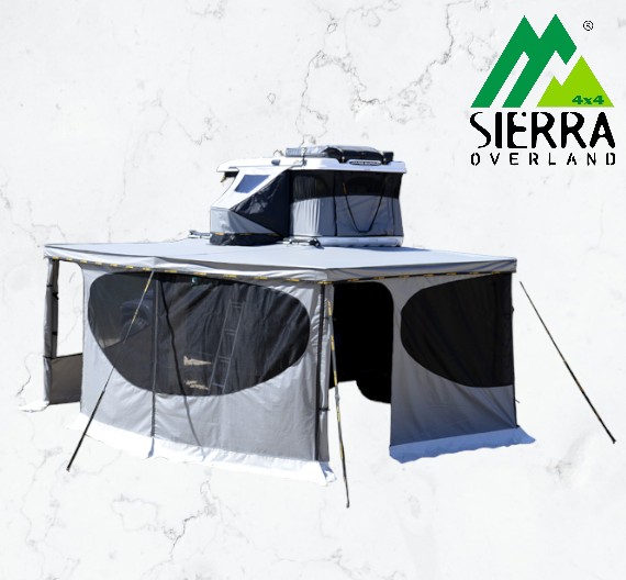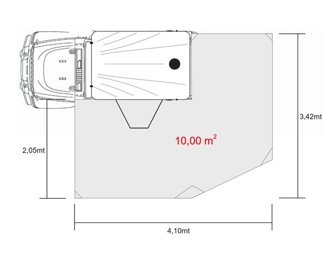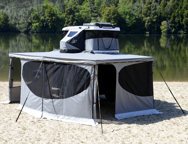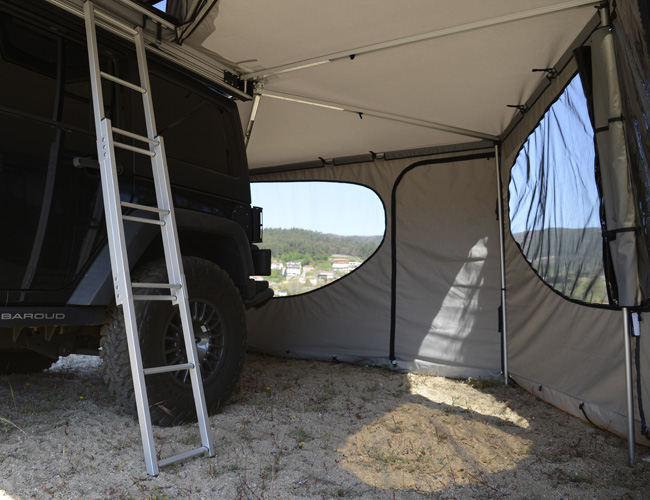 El cerramiento Falcon 270 grados es el complemento ideal para convertir tu toldo Falcon en un espacio íntimo y protegido de 10 m2. Compuesto de 3 paredes que se fijan directamente en la estructura del toldo y que se unen entre sí mediante cremalleras cubre la parte lateral de tu vehículo (derecha o izquierda, según modelo escogido) hasta la parte trasera. Sus grandes ventanas de plástico tintado y ventanas con mosquiteras, además de sus dos puertas de acceso, proporcionan gran visibilidad y ventilación en el interior. Su tejido, 100% impermeable y resistente a los rayos UV, reduce la sensación de calor hasta 8 grados en verano y mantiene la temperatura en invierno.