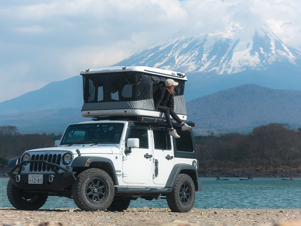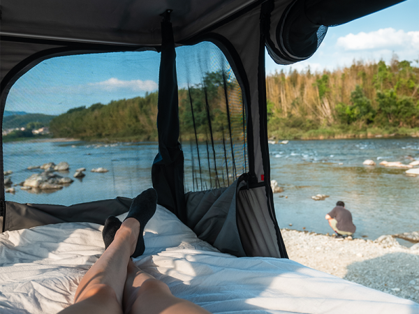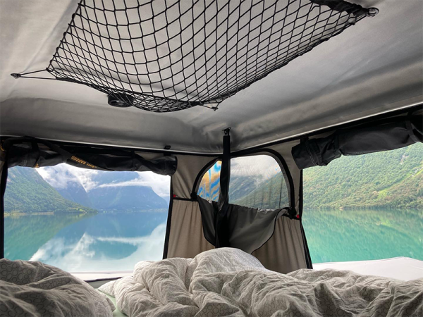 Tienda de techo para coche de la marca James Baroud. Cubierta rígida con apertura horizontal totalmente impermeable y resistente a vientos de más 120 km/h que se adapta a cualquier vehículo que lleve unas barras de techo reforzadas. Al no incorporar bandeja portaequipajes en la cubierta obtiene una misma altura de 100 cm en ambos lados, que permite al adulto sentarse cómodamente y gozar de vistas panorámicas de 360º. No requiere de homologación y puede almacenarse cuando no se utiliza.