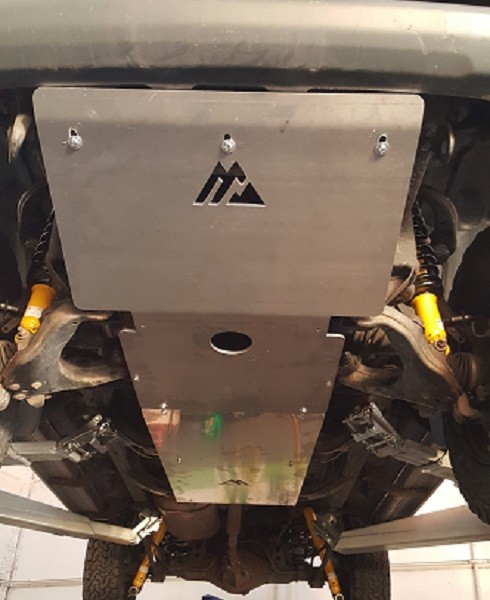 Este protector está fabricado en aluminio de alta dureza de 8mm plegado con control numerico y cortado por láser. Protege la caja de cambios y la caja transfer de los impactos de las piederas y ramas