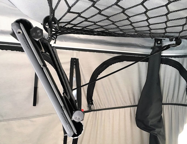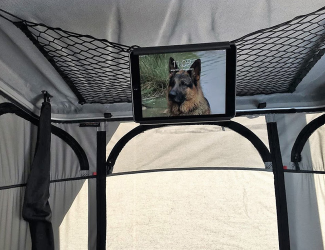 El Soporte Universal para Tablet es otra solución para disfrutar del máximo confort cuando viajas con tienda de techo James Baroud. Se adapta a las medidas de la mayoría de tablets (de 150 mm a 240 mm) gracias a un sistema de velcros, y se fija en la red portaobjetos del techo de la tienda.