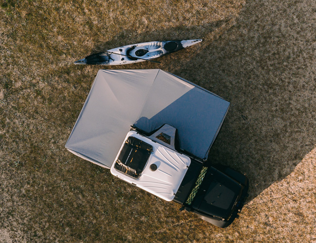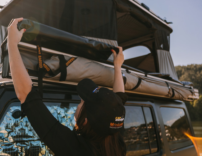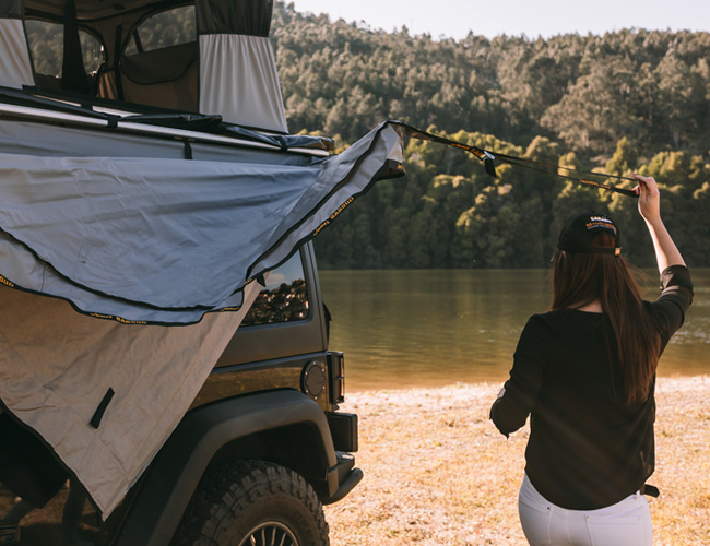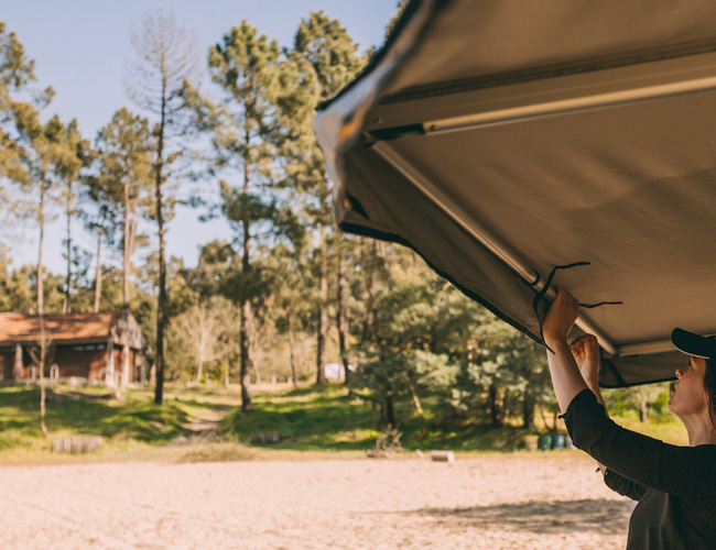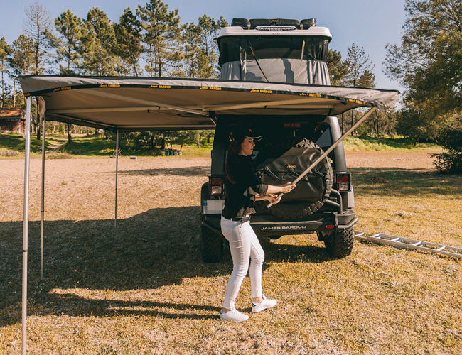 El Toldo Falcon 270º es universal, pero debes escoger el modelo derecho o izquierdo, según te interese instalarlo en un lado u otro del vehículo. La instalación se hace con unas platinas y escuadras reforzadas suministradas para su sujeción. Una vez lo instalamos, usarlo es muy fácil, porque es ligero y se despliega en forma de abanico tirando fácilmente de una cinta, cubriendo desde la parte lateral de tu vehículo (lado del copiloto o del piloto) hasta la parte trasera. Son 270º de cobertura que quedan suspendidos sobre una estructura robusta de aluminio, de dónde salen las patas telescópicas ajustables en altura. El tejido de poliéster aluminizado es 100% impermeable y resistente a los rayos UV,  y reduce hasta 8 grados la sensación de calor y mantiene la temperatura en invierno. Para guardarlo, sólo hace falta recogerlo bajo una resistente funda de PVC.